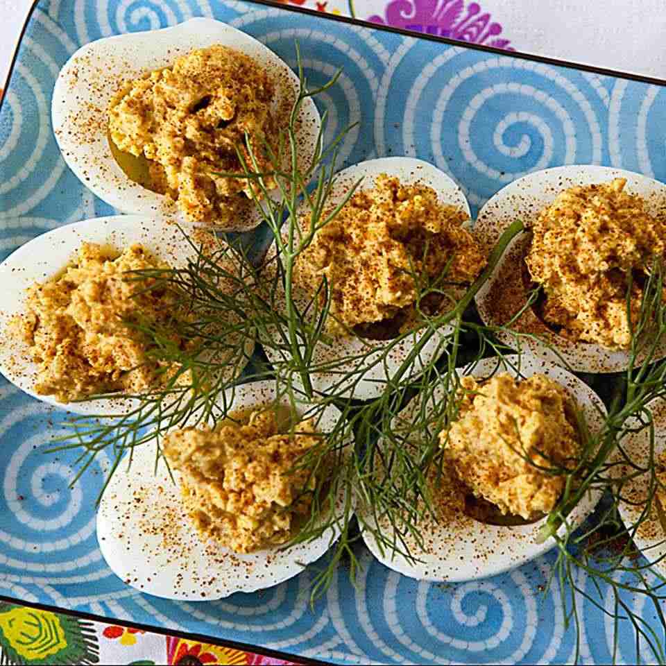- Step 2:Cut eggs in half, lengthwise. Remove the egg yolks and mash them together in a small mixing bowl. Mix in the paprika, mayonnaise, and dry mustard. Spoon mixture into the egg whites; cool and serve.